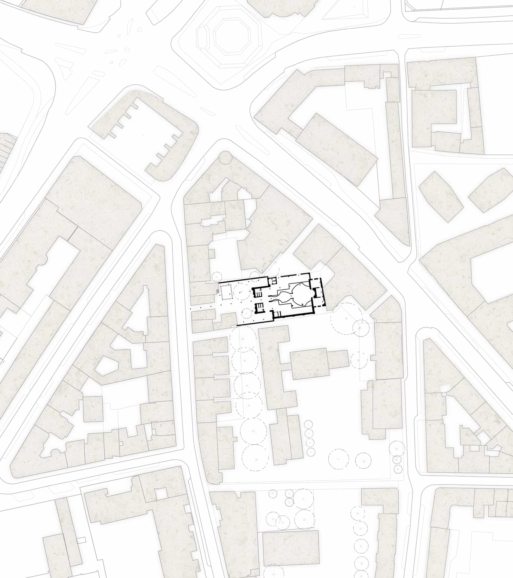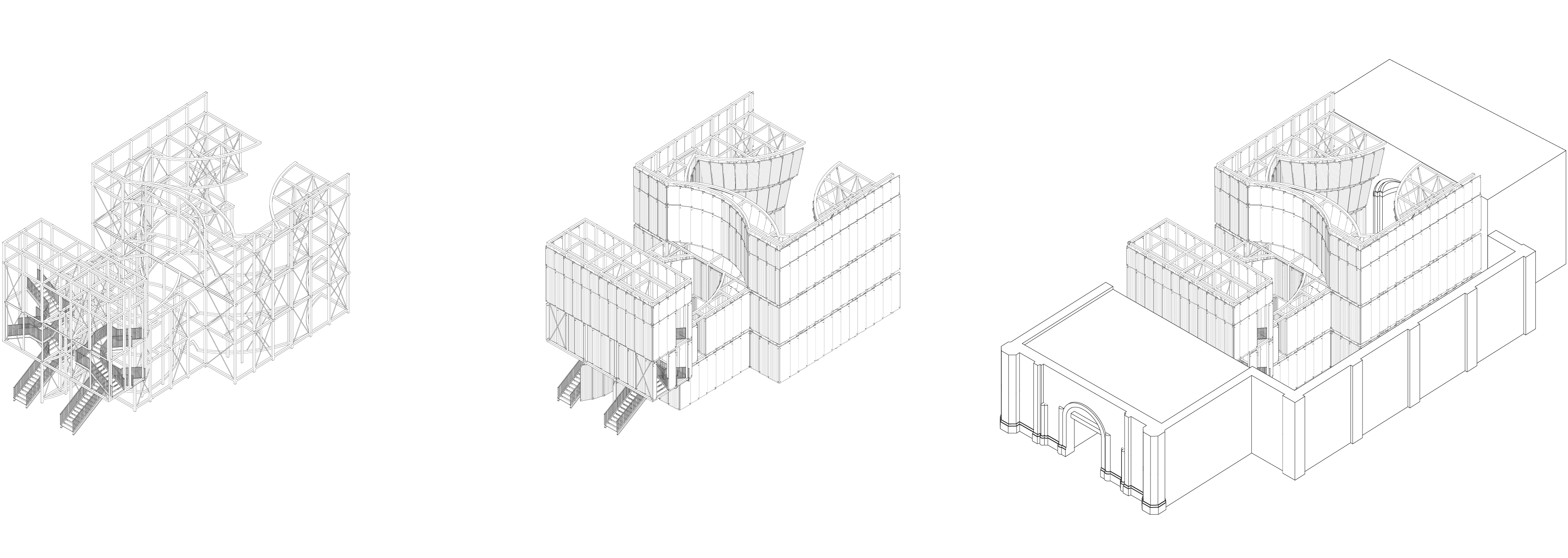 Der Entwurf zieht zunächst ein Raster an Stützen ein, die sich in ihrem Rhythmus an den baulichen Überresten des israelitischen Tempels orientieren, jedoch über das gesamte Grundstück und die Toreinfahrt bis zur Straße gezogen werden, und den übrigen Entwurf im Wortsinn „tragen“ - das eigentliche Gebäude scheint über sich selbst hinaus zu vibrieren. Während im Äußeren eine nüchterne Kubatur und Fassadengestalt die ruinösen Fragmente des zerstörten Tempels in den Vordergrund rücken, wird im Innern eine unerwartete, eigene Welt erzeugt: eine von oben belichtete Stahlkonstruktion wird allseitig mit Gussglasplatten bekleidet, und bildet den diffus leuchtenden Kern des Gebäudes, der in seinem Innern, in beinahe barockem Formwillen, den Gebetsraum trägt. Die erhaltene Apsis mit dem Toraschrein bildet hierbei das zentrale Element, an dem der Rhythmus der Stützen endet.